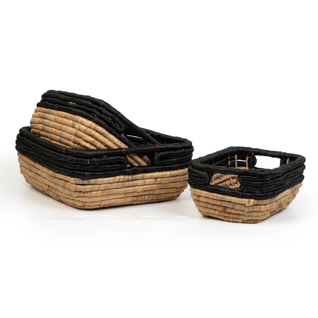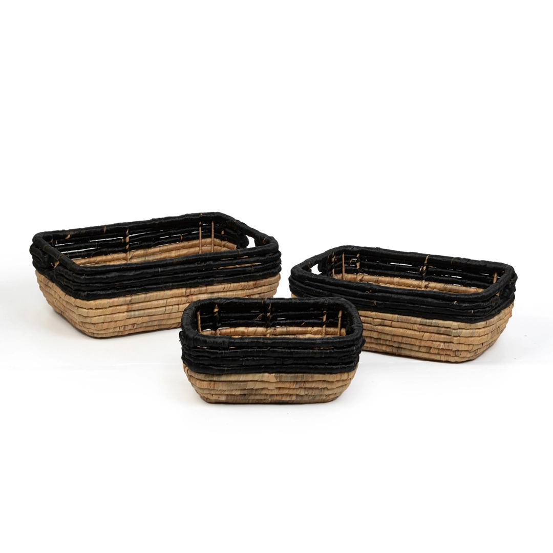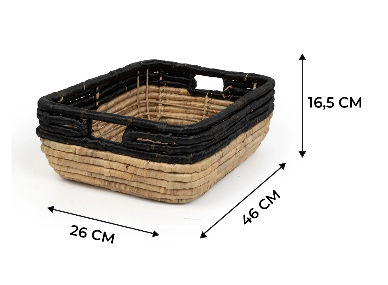 Duży, pojemny kosz pleciony z naturalnych materiałów: hiacyntu wodnego i trawy morskiej. Kontrast naturalnej podstawy i głębokiej czerni sprawia, że kosz wygląda bardzo nowocześnie i świetnie wpisuje się w klimat loftu oraz industrialu. To model cięższy i solidny, idealny do przechowywania większych rzeczy.