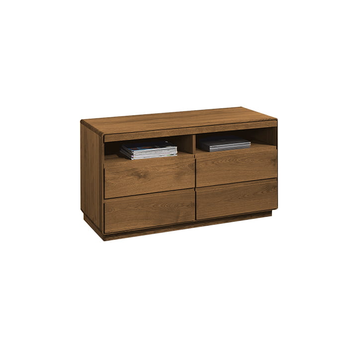 Każdy odbiornik telewizyjny potrzebuje odpowiedniej rozmiarowo komody, aby wyeksponować i uzupełnić przestrzeń pod nim. Dlatego powstała niewielka, ale wyższa od standardowych dębowa komoda z kolekcji Altea. Kolejna z odsłon szafek RTV z tej kolekcji. Pojemna i bardzo praktyczna, może stanowić z powodzeniem uzupełnienie niewielkiej wnęki lub w wolnej przestrzeni współgrając na przykład z witryną tworzyć niezwykłą aranżację salonu. Na pewno dzięki swoim nietypowym wymiarom znajdzie swoich zwolenników wśród właścicieli niewielkich pomieszczeń. Komoda TV posiada dwie otwarte półeczki, dwie pojemne szuflady pracujące na prowadnicach z cichym domykiem i szafkę po lewej stronie w której front tak sprytnie zaprojektowano, że tworzy z szufladami umiejscowionymi po prawej stronie spójną całość. Maksymalne obciążenie komody to 35 kg, natomiast obciążenie szuflad maksymalnie 3 kg.