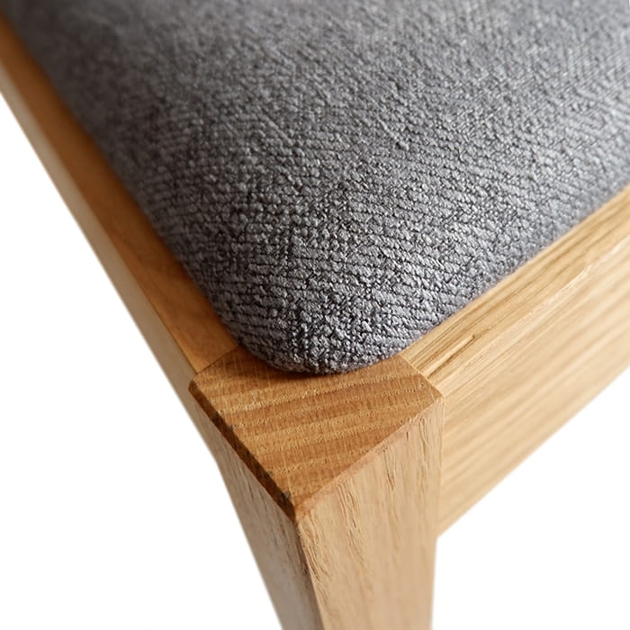 Dębowe krzesło Altea to idealny mebel, na szereg ważnych pytań można w jego przypadku odpowiedzieć twierdząco. Czy jest wygodne? - oczywiście tak. Czy tapicerka jest delikatna w dotyku i wytrzymała? - oczywiście tak. Czy jest trwałe? - tak. Czy jest solidnie wykonane? - niezaprzeczalne tak. Krzesło drewniane Altea zostało wykonane z drewna dębowego i jedynie zaolejowane bezbarwnym olejem naturalnym dla zachowania naturalnego efektu. Tapicerka wykorzystana na siedzisko i oparcie to wspaniała tkanina obiciowa. Bardzo wytrzymała na przetarcia, nie mechaci się i jest przyjemna w dotyku. Wybrany do naturalnego dębu kolor szary (Milton New 17 - firmy Fargotex) ukazany na zdjęciach idealnie pasuje do nowoczesnego wystroju pokoju młodzieżowego. Przy tym kolorystycznie jest bardzo funkcjonalny.