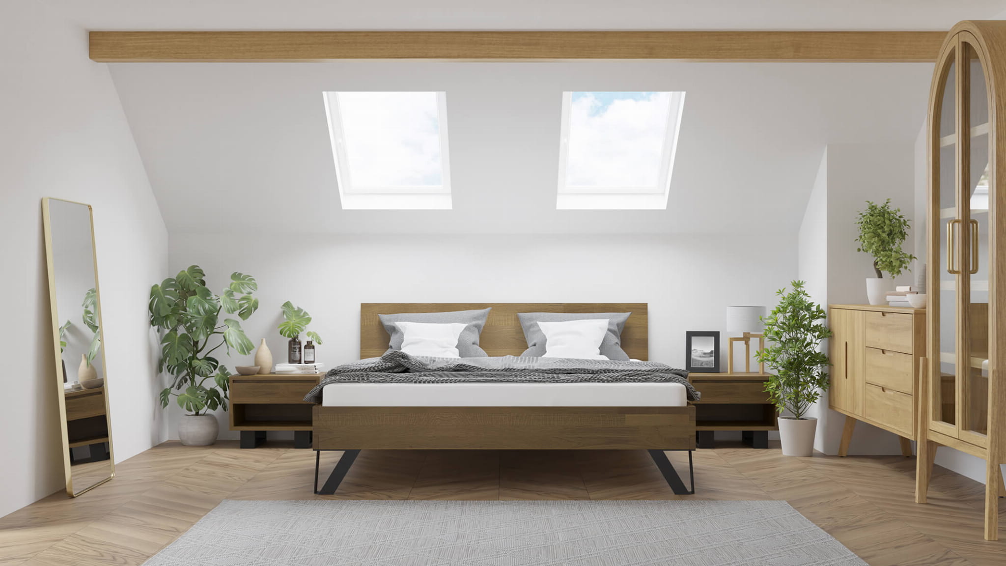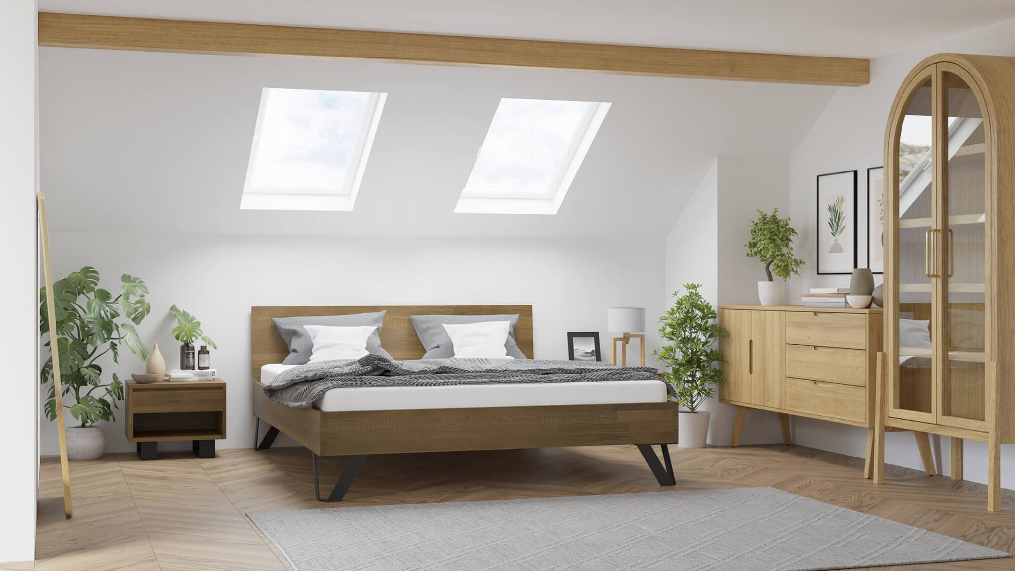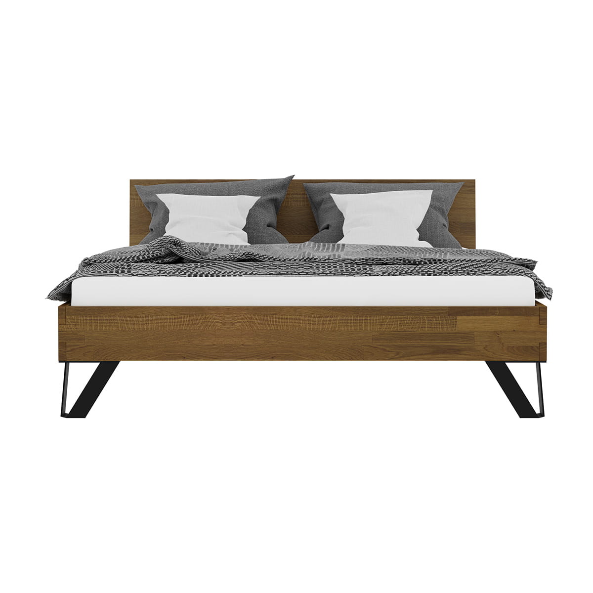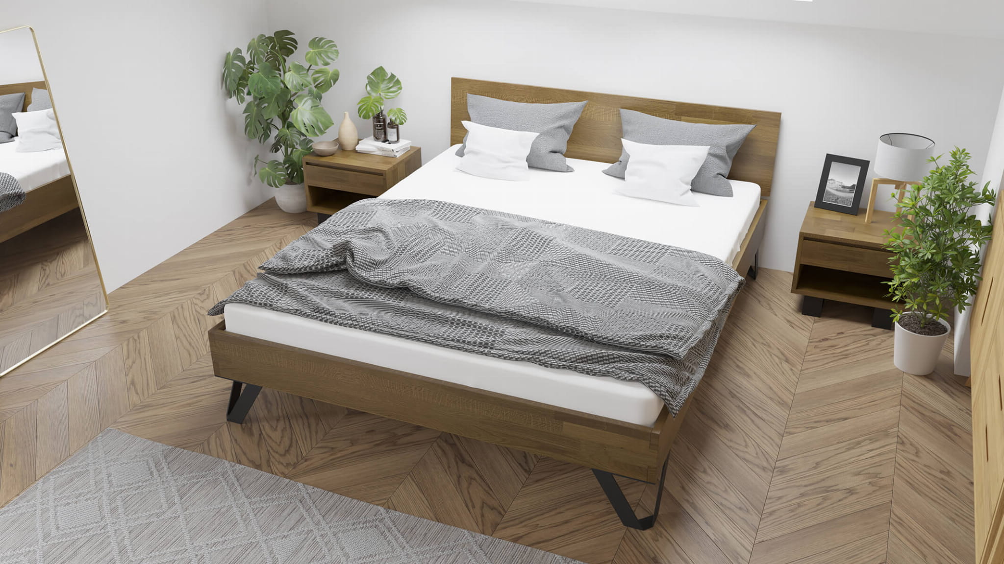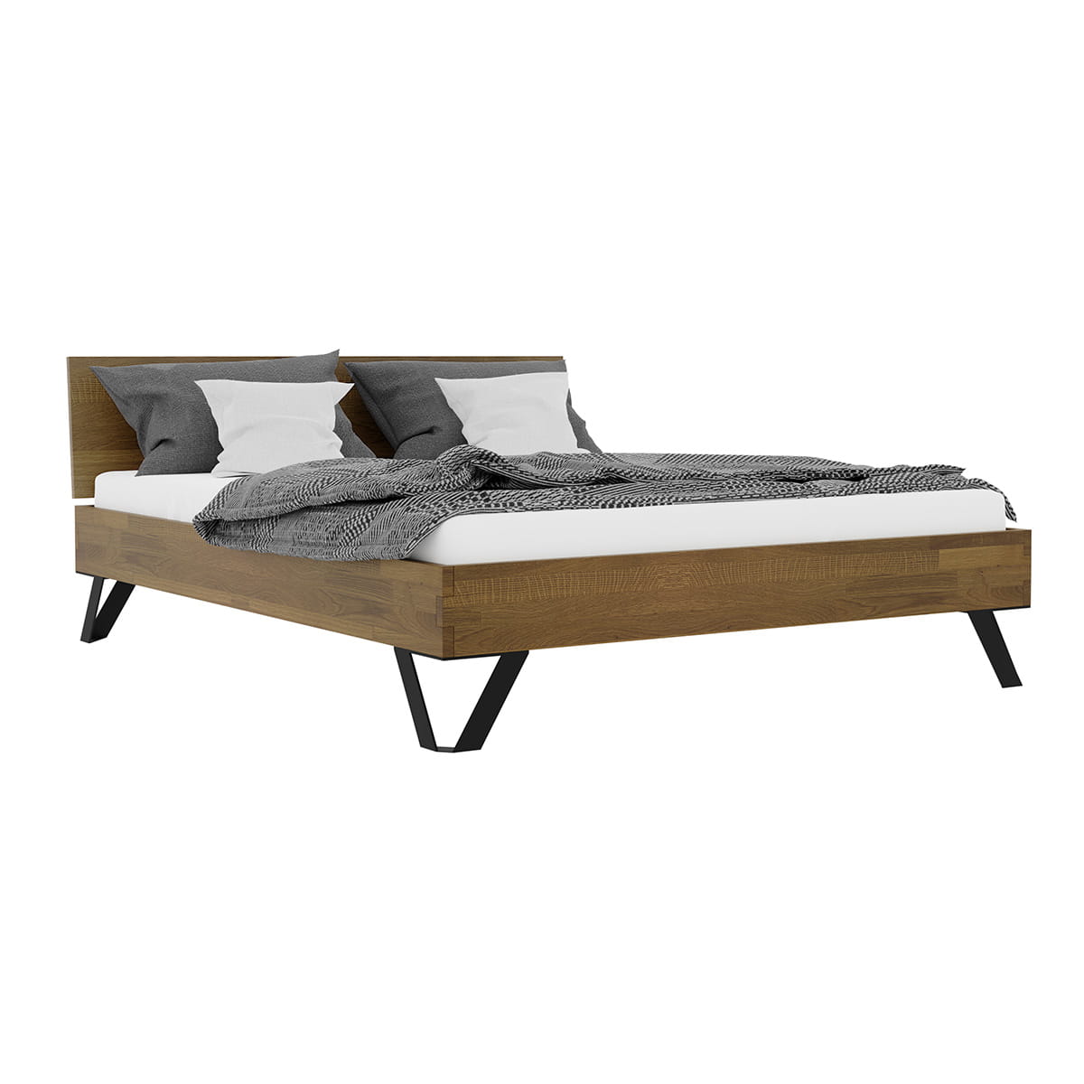 Dzięki zastosowaniu minimalistycznych, ale wytrzymałych nóżek, przestrzeń pod łóżkiem pozostaje do wykorzystania. Możesz ją dowolnie zagospodarować, umieszczając tam na przykład specjalnie dostosowany schowek lub ulubiony dywan. O Twoją wygodę dba dębowa rama podwójnego łóżka małżeńskiego, która jest dostępna nie tylko w prezentowanym rozmiarze 160x200 cm, ale także w dwóch innych standardowych wymiarach: 140x200 i 180x200. Ponadto, można wybrać inny zagłówek, na przykład dzielony na dwie części, lub zdecydować się na opcję bez zagłówka. Wybór jest szeroki i dostosowany do różnych preferencji.