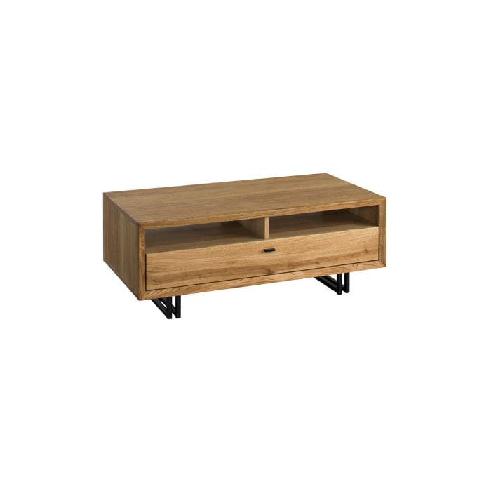 Salon urządzony w industrialnym lub nowoczesnym, minimalistycznym stylu wymaga dopasowanych, spójnych rozwiązań. To właśnie w tym pomieszczeniu przeważnie oglądamy telewizor i spotykamy się z gośćmi. Zadbaj więc o to, by był urządzony funkcjonalnie i elegancko. Drewniana ława kawowa to jeden z tych mebli, które są niezbędne w salonie, w którym chcesz urządzić kącik telewizyjny. Dzięki półce pod blatem i szufladzie zyskujesz funkcjonalny mebel, który sprytnie ukryje to, czego nie chcesz eksponować, a co przy tym chcesz mieć zawsze pod ręką. Będziesz mieć więc miejsce na pilota, dokumenty, podręczne przedmioty i inne drobiazgi.