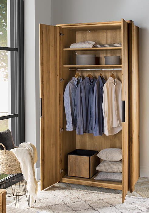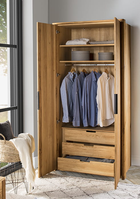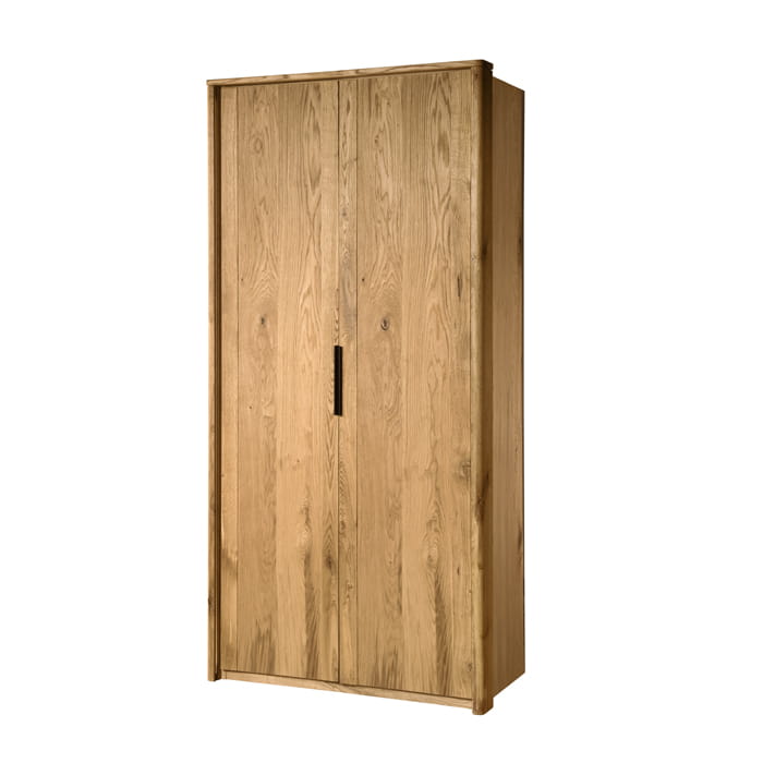 Szafa dębowa do sypialni z kolekcji Orio. Przechowuj swoje ubrania w solidnej i ładnej szafie Orio. Dobrze zorganizowane wnętrze szafy to podstawa. Nasza szafa oferuje dużo możliwości. W zależności jakie są potrzeby potencjalnego właściciela można szafę drewniana dostosować do swoich wymogów. Szafa 2d do sypialni posiada w zestawie dwie duże półki w górnej części oraz jeden drążek na wieszaki. Drzwi do szafy posiadają zawiasy z cichym domykiem. Wspaniała okazała szafa to niezbędnik każdej sypialni. Korpus meble pokryty jest naturalnym fornirem rustykalnym. Fronty szafy to lite drewno sęczne.