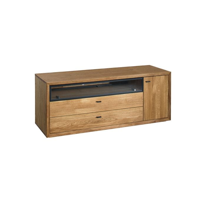 Komoda TV dzięki temu, że prócz szuflad ma dwie części do przechowywania (przeszklona półka i szafka), pomieści najważniejsze drobiazgi, jak dokumenty, ładowarki czy gazety. Na blacie możesz postawić telewizor lub dekoracje.
