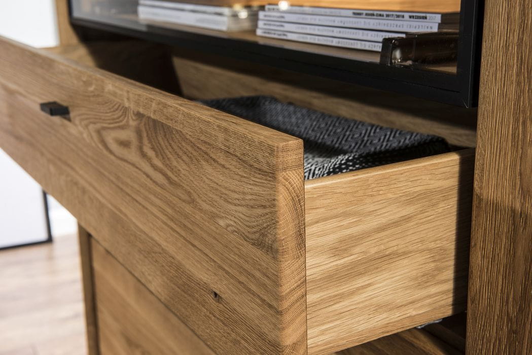 Wybierając dębowe meble do salonu z kolekcji Vivo stawiasz na elegancję, jakość i funkcjonalność. Połączenie solidnego, szlachetnego drewna o eleganckim i naturalnym wyglądzie z nowoczesnymi, metalowymi elementami w loftowym stylu sprawia, że meble idealnie pasują do nowoczesnych, industrialnych wnętrz!