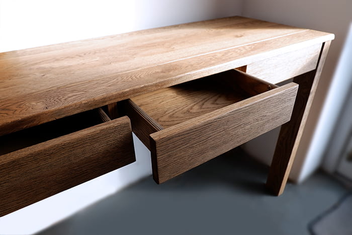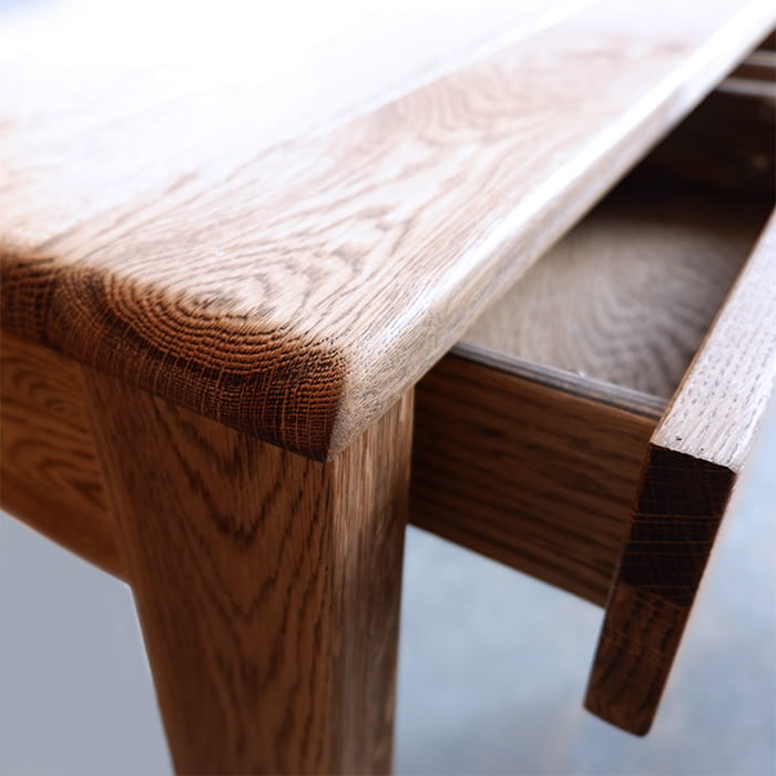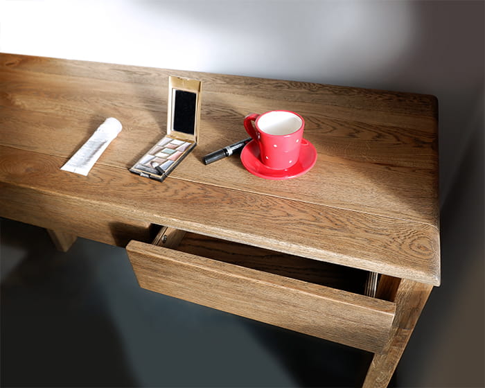 Toaletka posiada trzy bardzo praktyczne szuflady na drobiazgi ukryte pod blatem, wprost stworzone do przechowywania kosmetyków, drobiazgów w pracowni, bibelotów i szpargałów. Szuflady poruszają się na prowadnicach z cichym domykiem. Drewno użyte do produkcji konsoli zostało specjalnie wyszczotkowane dzięki czemu słoje oraz naturalne rysy podkreślają jej naturalny charakter. Jest to jeden z wielu mebli z kolekcji Altea, która oprócz wybarwienia dąb palony występuje także w kolorze dąb naturalny.