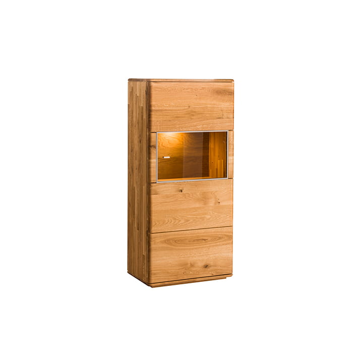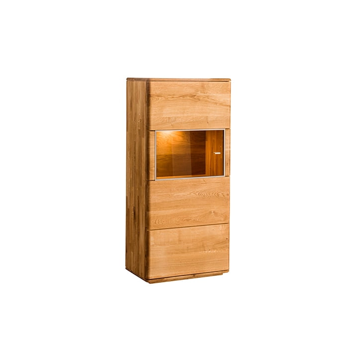 A teraz parę słów o prezentowanej witrynce dębowej. Wymiar idealny do zastosowania w jadalni lub jako uzupełnienie po drugiej stronie asymetrycznej aranżacji salonu w połączeniu z wysoką witrynką i szafką pod telewizor. Cudownie prezentuje się z oświetleniem nadając pomieszczeniu stylowego klimatu. Odpowiednio ozdobiona dodatkami w konkretnym stylu dopasuje się do wymarzonego i zaplanowanego pomieszczenia. Jest jak czyste płótno, uniwersalna i funkcjonalna dzięki zastosowaniu drewna dębowego. Produkowana w dwóch opcjach: lewostronnej i prawostronnej. Nieco inne spojrzenie na wykończenie mebla drewnianego zastosowane poprzez mocniej podkreślony naturalny rysunek usłojenia przypomina czas jaki był potrzebny, aby ten niepowtarzalny mebel pojawił się w naszym pomieszczeniu. Grube drewniane drzwi pracujące na zawiasach z cichym domykiem i masywne półki pozwolą na odpowiednie wykorzystanie przestrzeni wewnątrz witryny drewnianej. Trzy półki dzielą przestrzeń na dość duże cztery strefy, jedna z nich jest widoczna dzięki zastosowaniu przeszklenia i tam możemy zaszaleć. Ustawić ulubione książki w pięknych ozdobnych wydaniach, a może kryształy przekazywane w rodzinie pieczołowicie pielęgnowane lub stylowe dodatki dopełniające wnętrza minimalistycznego. Nuta nowoczesnego designu w postaci malutkiej klamki w srebrnym kolorze odpowiednio wyprofilowanej dla wygody użytkowania to swoista wisienka na torcie. Mebel dzięki zastosowanej technice i procesowi produkcji jest trwały i solidny. Będzie cieszył oko i przyciągał wzrok gości przez wiele lat.