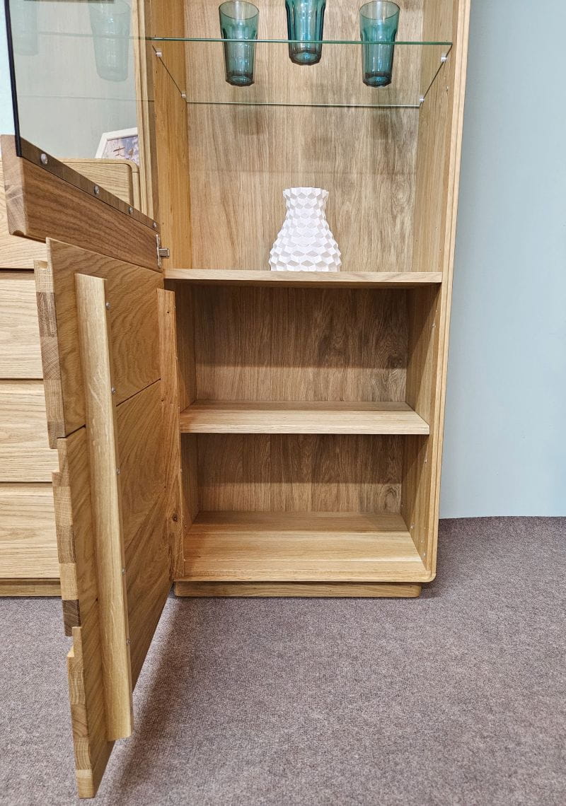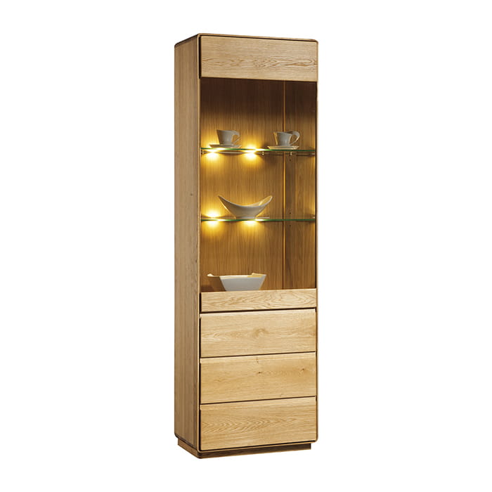 Salon spełnia funkcję wizytówki twojego domu, w nim zwykle spotykamy się ze znajomymi, spraszamy w odwiedziny rodzinę. Z tej właśnie przyczyny ważne jest aby zainwestować w meble wypełniające tą przestrzeń zgodnie z naszymi wyobrażeniami. Witryna wąska dębowa z kolekcji Altea została wykonana w klasycznym stylu. Nienachalna i prosta bryła, delikatne zaokrąglone rogi i powiew świeżości uzyskany dzięki nowoczesnemu oświetleniu led zastosowanemu w szklanych półkach.