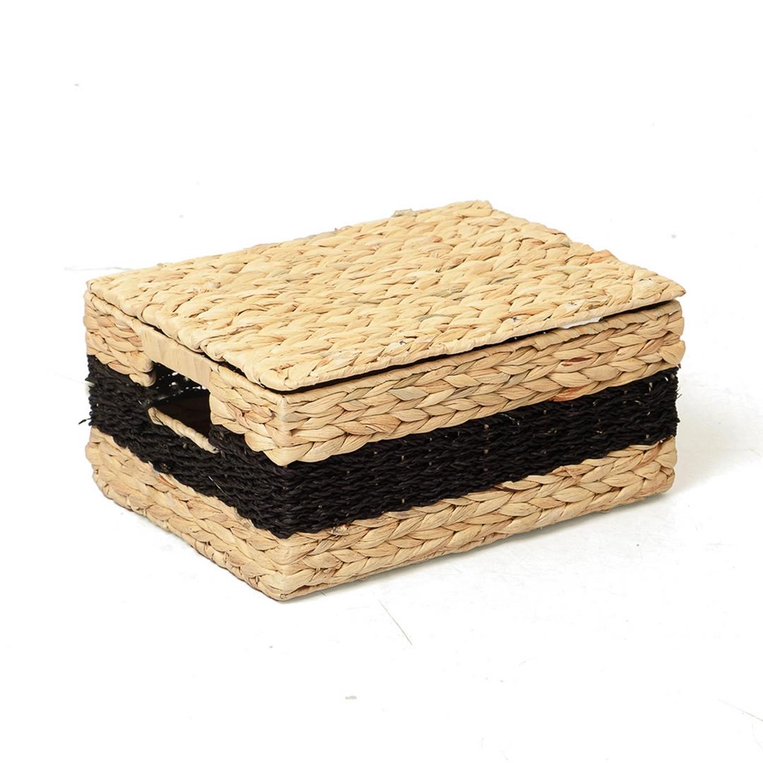 Nowoczesny koszyk z hiacyntu wodnego z czarnym dodatkiem w rozmiarze M przeznaczony do organizacji przestrzeni w sypialni, gabinecie lub pokoju dziennym, zamykany więc i dyskretny.