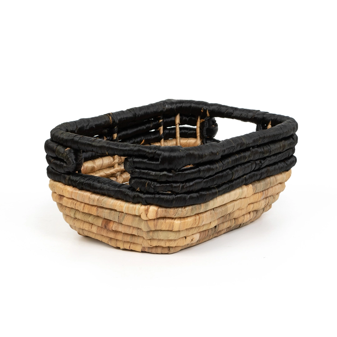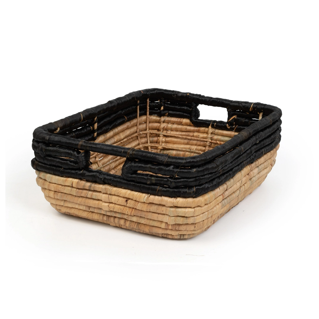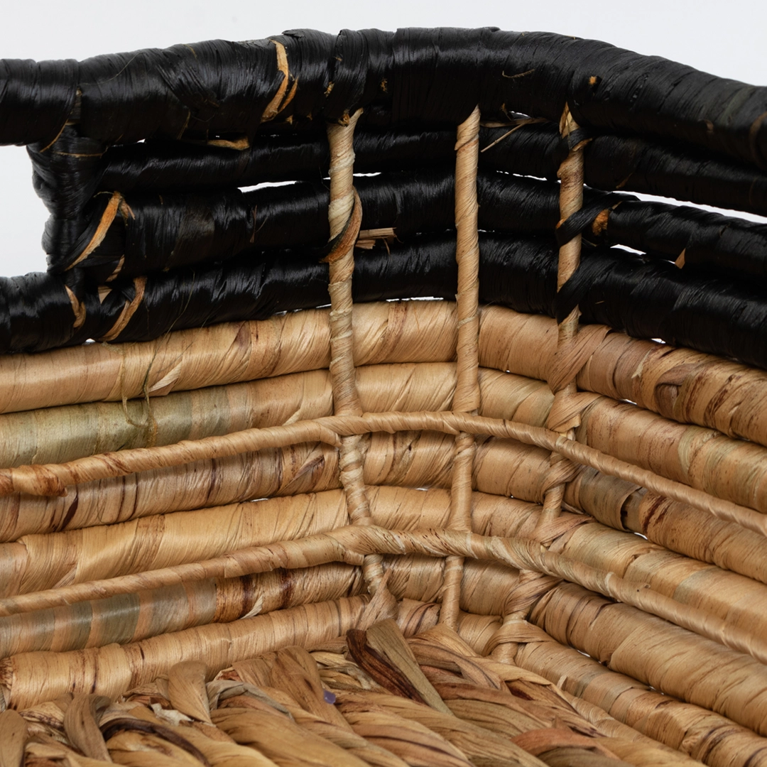 Nowoczesny zestaw trzech koszy plecionych wykonanych z naturalnego hiacyntu wodnego i trawy morskiej. Kontrast ciepłego, naturalnego odcienia z głęboką, intensywną czernią nadaje im wyrazisty, loftowy charakter.