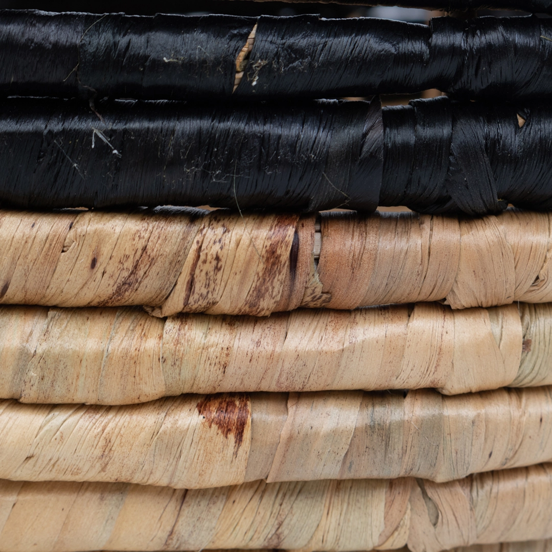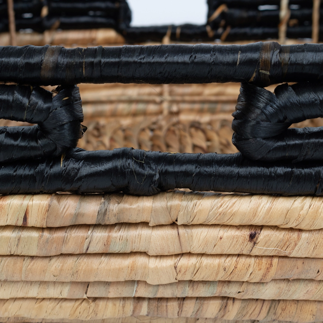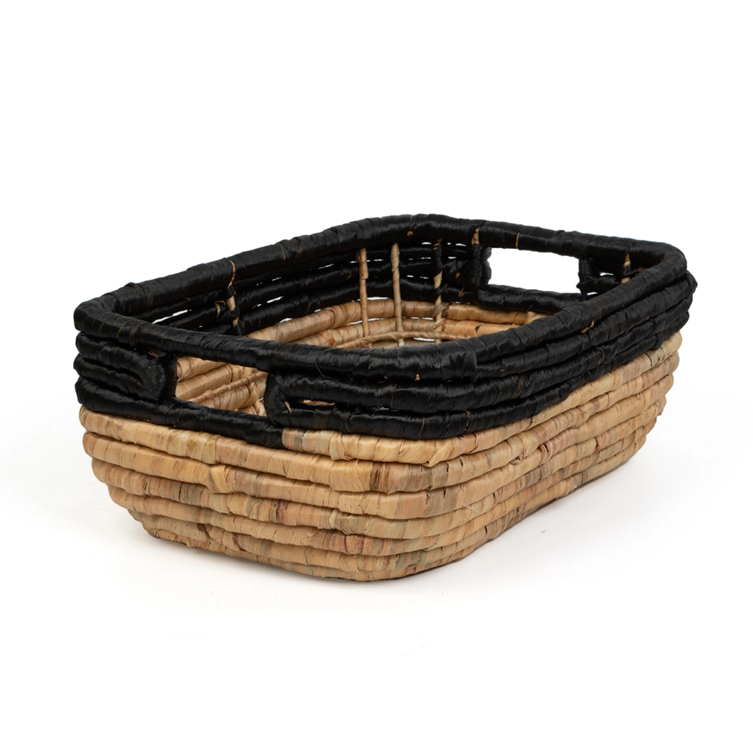 Nowoczesny zestaw trzech koszy plecionych wykonanych z naturalnego hiacyntu wodnego i trawy morskiej. Kontrast ciepłego, naturalnego odcienia z głęboką, intensywną czernią nadaje im wyrazisty, loftowy charakter.